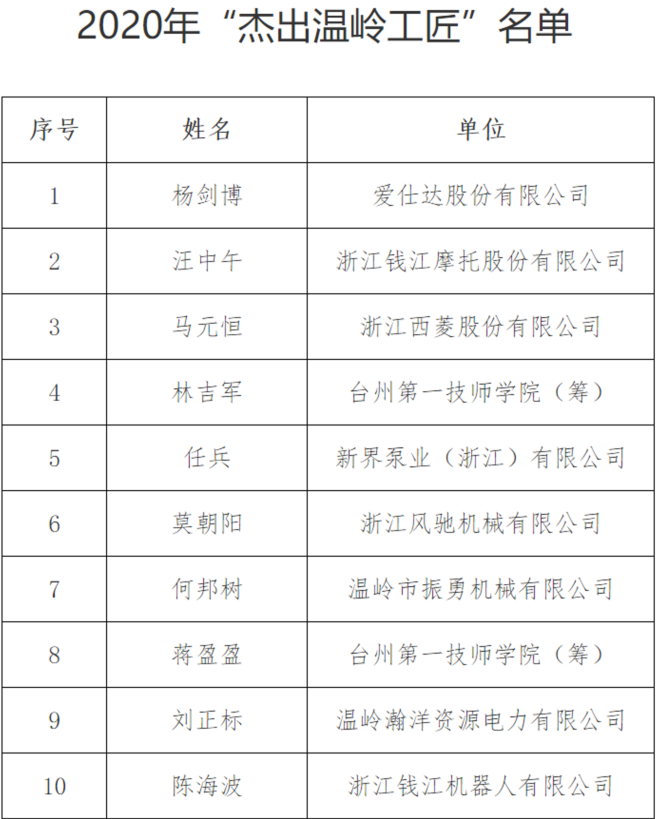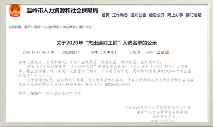公司員工莫朝陽入選為“杰出溫嶺工匠”